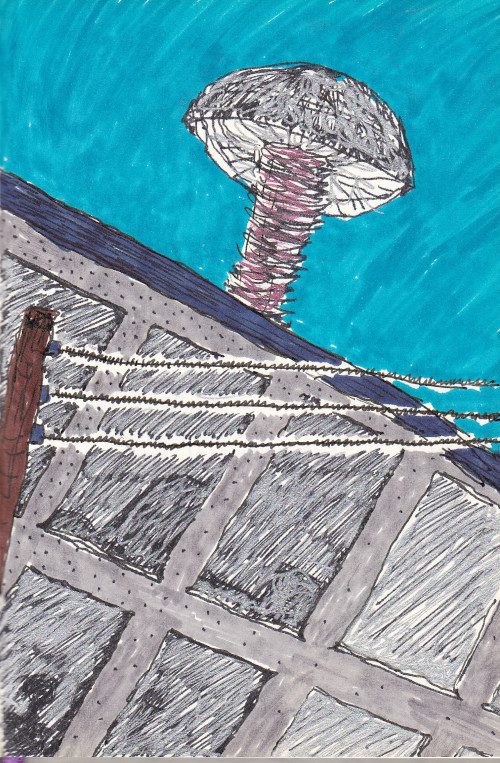 Looking up at a tall building on which was an inexplicable kind of mushroom sculpture. Suddenly the whole thing was snatched away by something invisible. It was jerked suddenly away and out of sight in a manner that felt violent, cruel, and sinister – because I could not see who or what had done this. In that moment of shocking, unexpected movement, there was nothing.